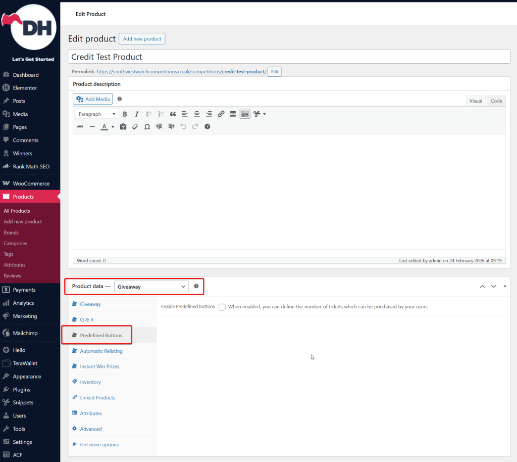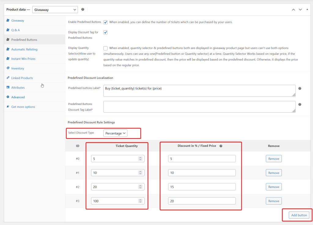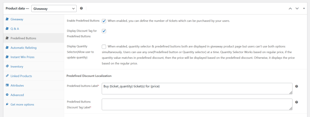 1. Go to Products >All Product or Add a Product > Select a product > Product Data – Giveaway > Predefined Buttons