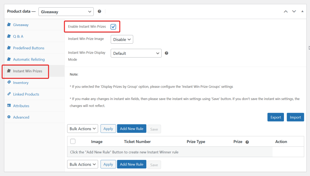 • Tick the ‘Enable Instant Win Prizes‘ checkbox.