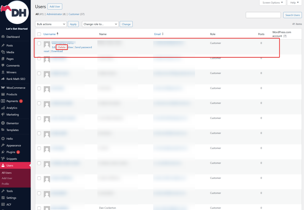 - Hover over the user and click Delete.